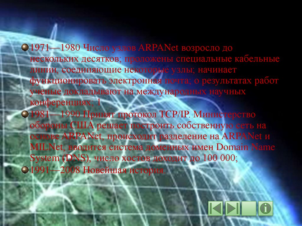 1971—1980 Число узлов ARPANet возросло донескольких десятков; проложены специальные кабельные