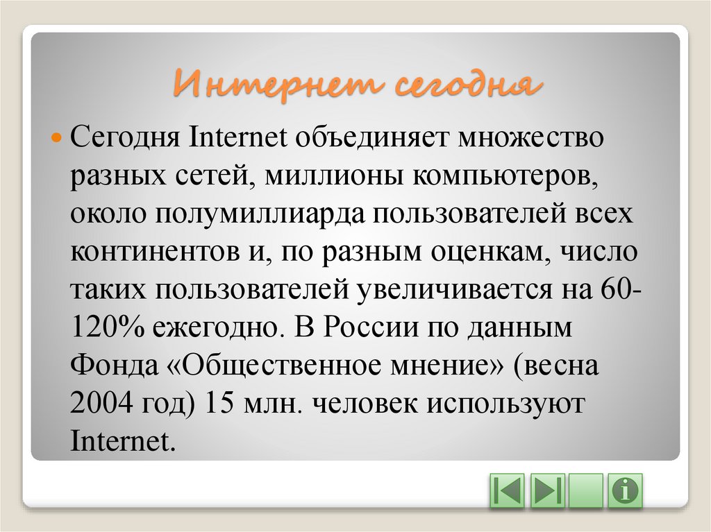 Сегодня Internet объединяет множестворазных сетей, миллионы компьютеров,