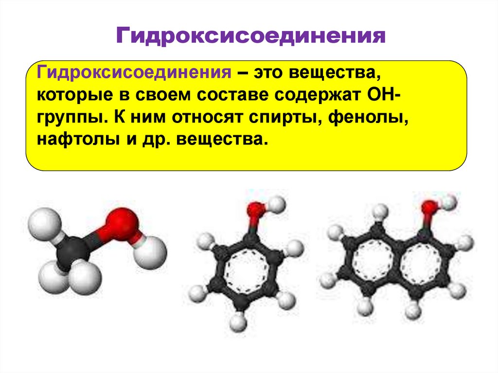 Гидроксисоединения – это вещества,которые в своем составе содержат OHгруппы. К ним относят спирты, фенолы,