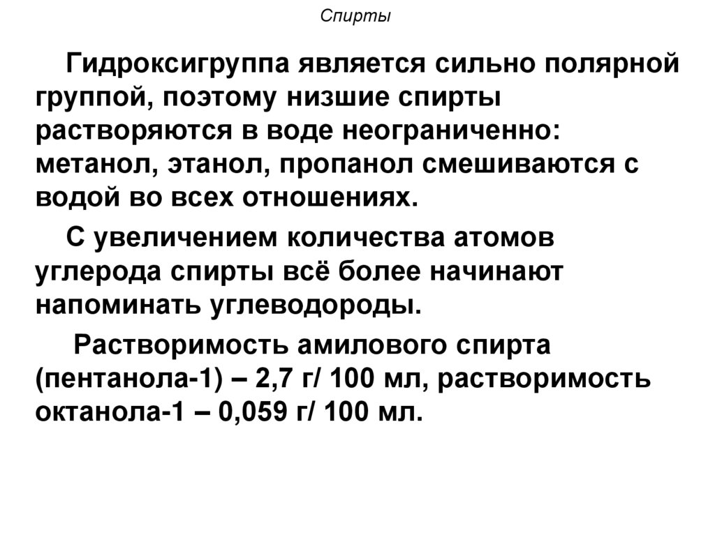 Гидроксигруппа является сильно полярнойгруппой, поэтому низшие спирты