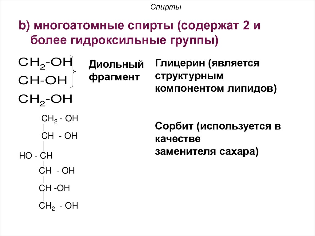 b) многоатомные спирты (содержат 2 иболее гидроксильные группы)