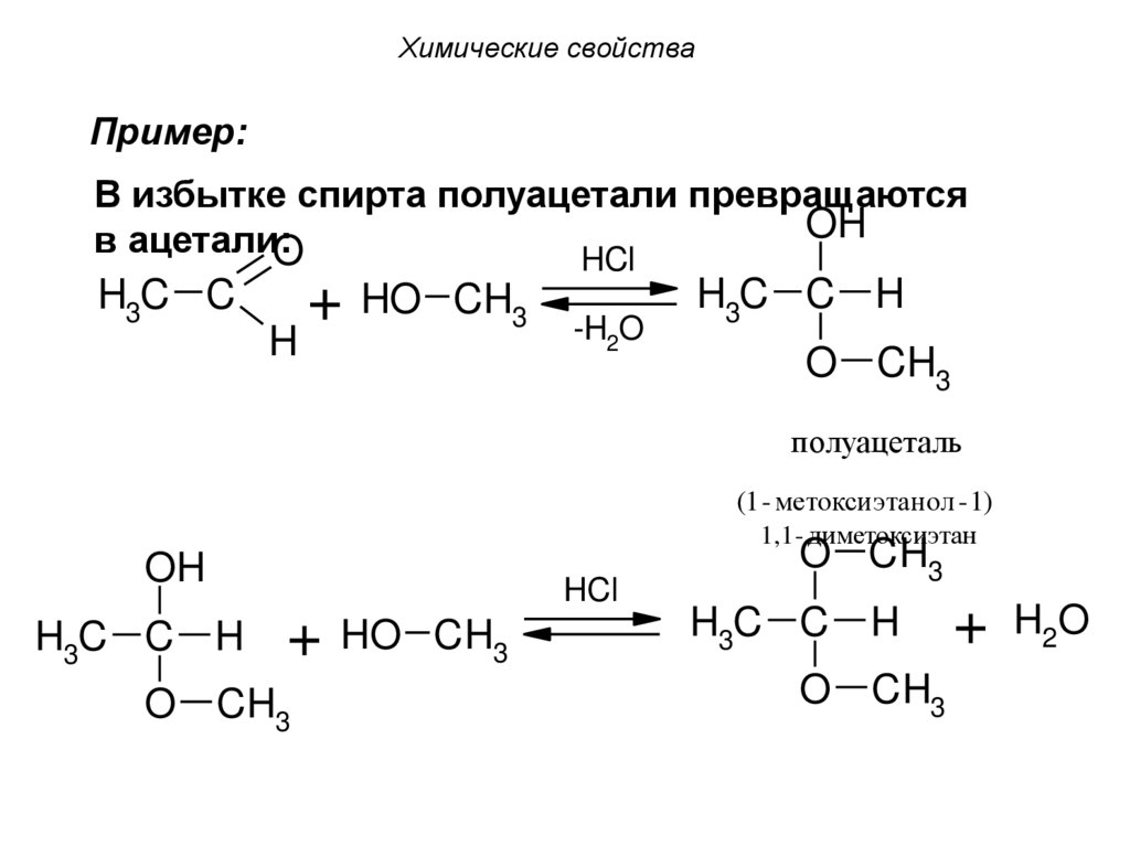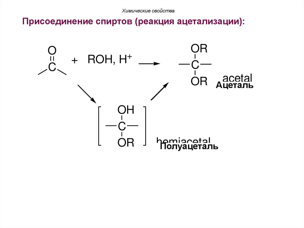 Химические свойстваПрисоединение спиртов (реакция ацетализации):