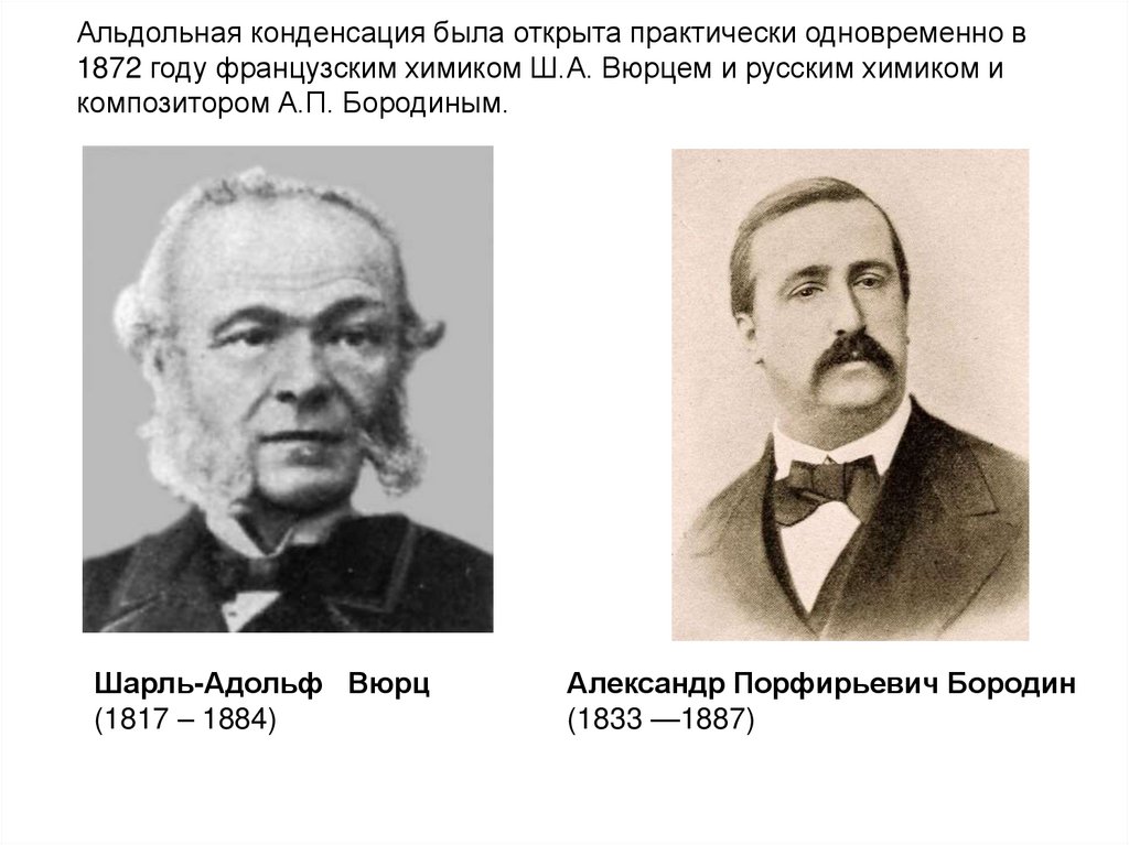Альдольная конденсация была открыта практически одновременно в1872 году французским химиком Ш.А. Вюрцем и русским химиком и