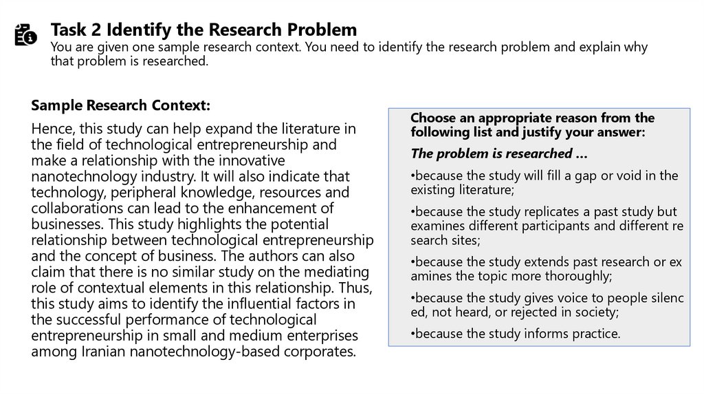 Understanding the importance of research context,problem identification, and research questions;