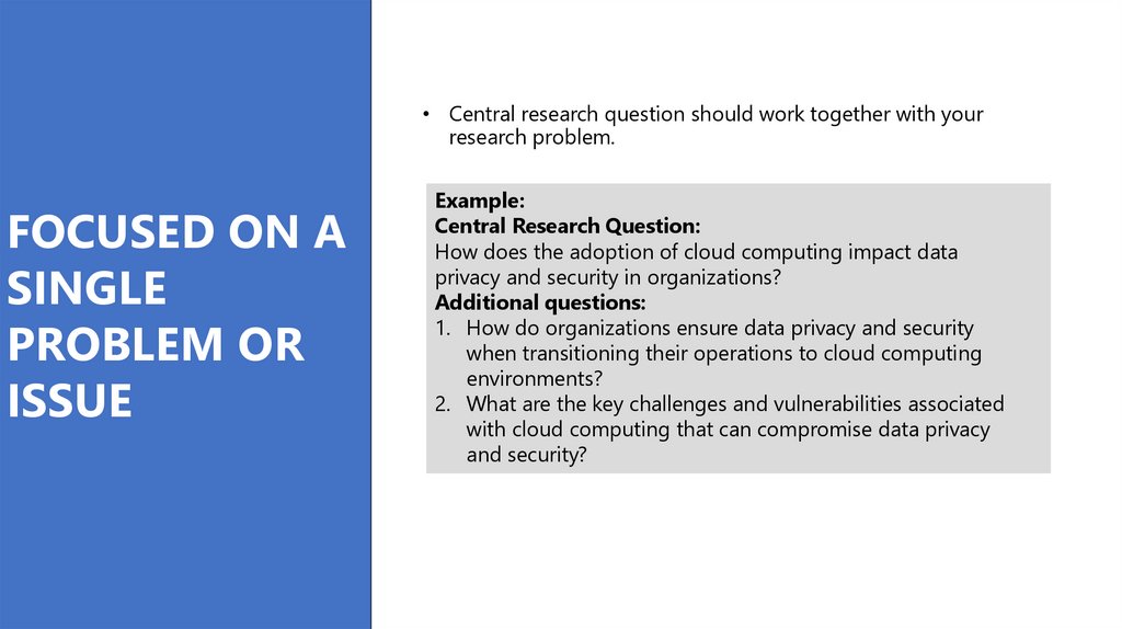 • Central research question should work together with your