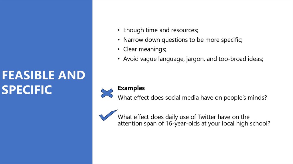 • Avoid vague language, jargon, and too-broad ideas;