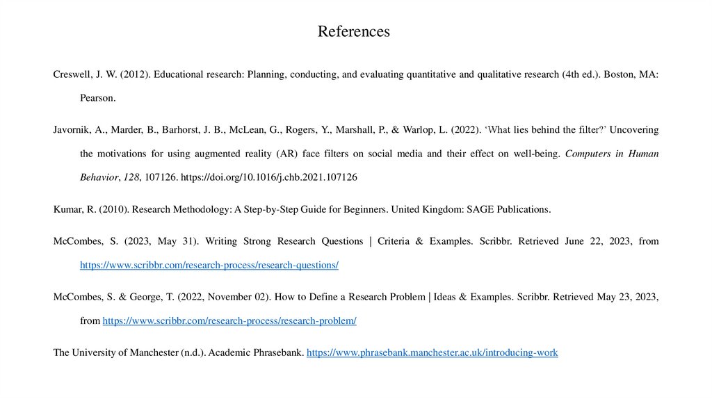 ReferencesCreswell, J. W. (2012). Educational research: Planning, conducting, and evaluating quantitative and qualitative research (4th ed.). Boston, MA: