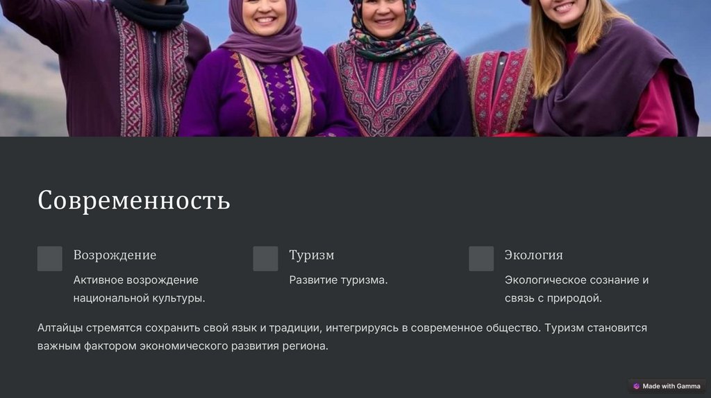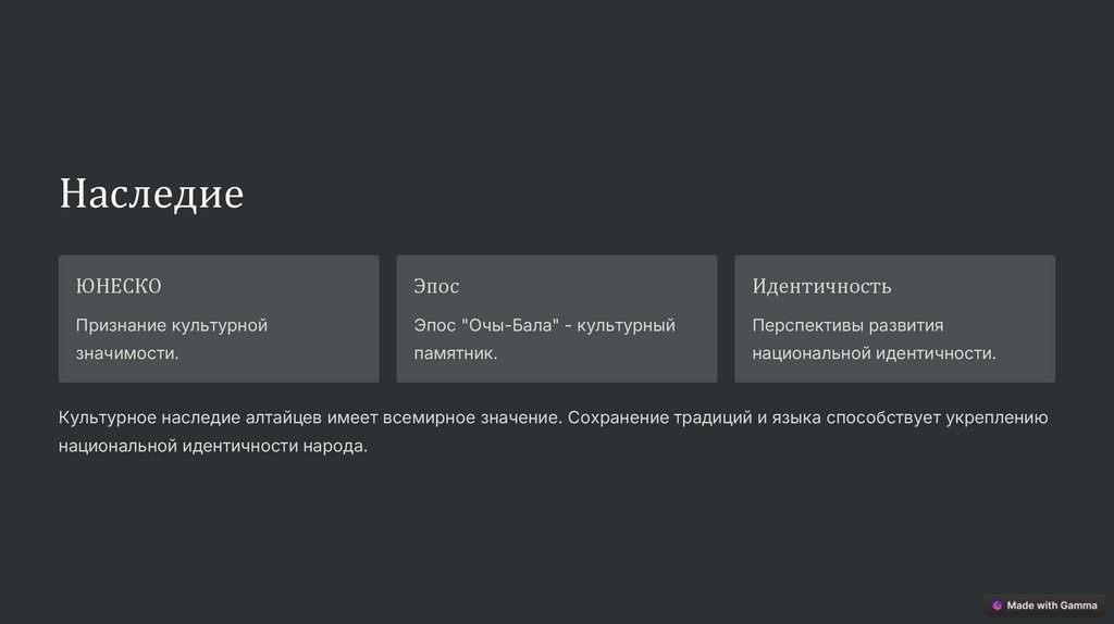 Культурное наследие алтайцев имеет всемирное значение. Сохранение традиций и языка способствует укреплению