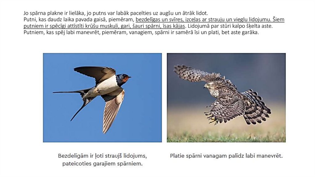 12. Jo spārna plakne ir lielāka, jo putns var labāk pacelties uz augšu un ātrāk lidot. Putni, kas daudz laika pavada gaisā,