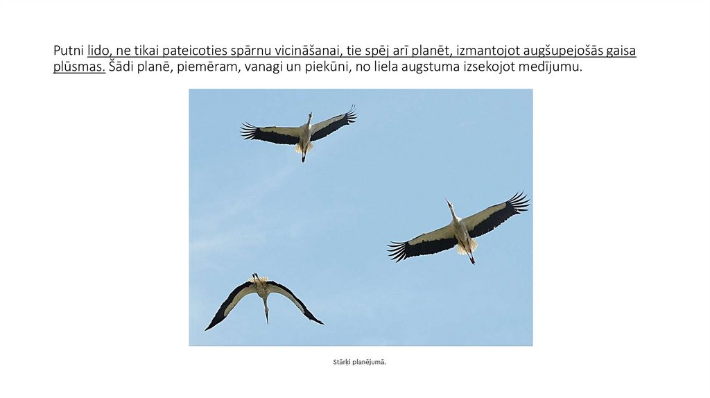 13. Putni lido, ne tikai pateicoties spārnu vicināšanai, tie spēj arī planēt, izmantojot augšupejošās gaisa plūsmas. Šādi planē,