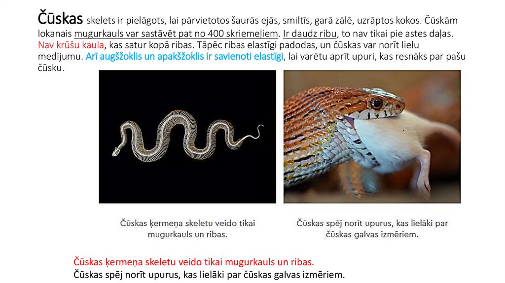 sastāvēt pat no 400 skriemeļiem. Ir daudz ribu, to nav tikai pie astes daļas.Nav krūšu kaula, kas satur kopā ribas. Tāpēc ribas elastīgi padodas, un čūskas var norīt lielu