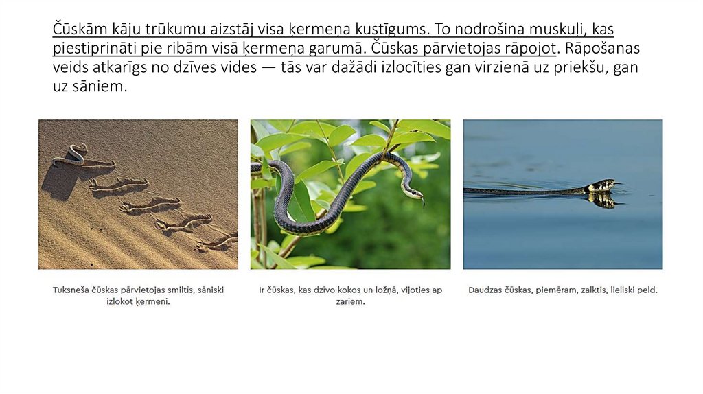 17. Čūskām kāju trūkumu aizstāj visa ķermeņa kustīgums. To nodrošina muskuļi, kas piestiprināti pie ribām visā ķermeņa garumā.