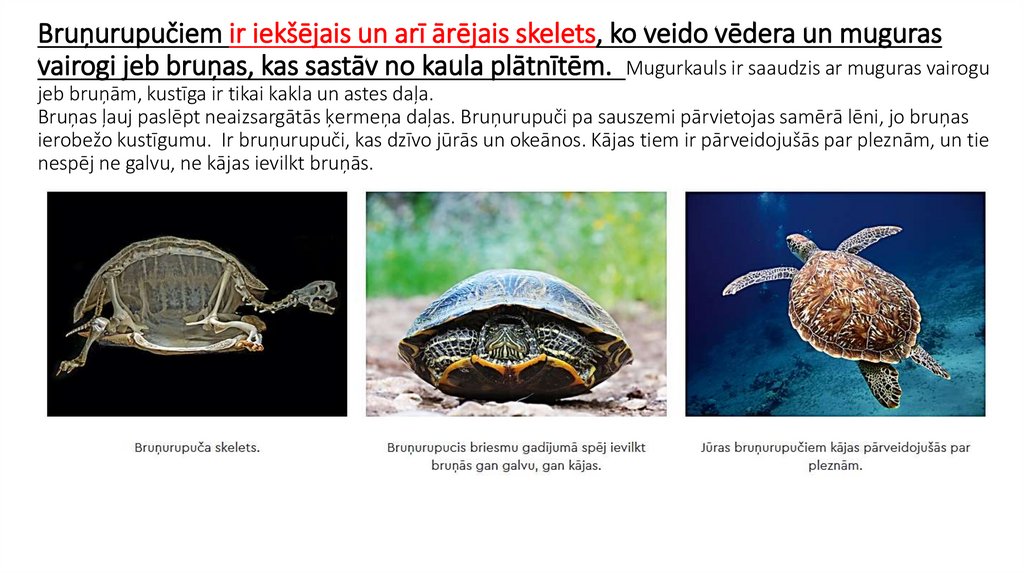 18. Bruņurupučiem ir iekšējais un arī ārējais skelets, ko veido vēdera un muguras vairogi jeb bruņas, kas sastāv no kaula