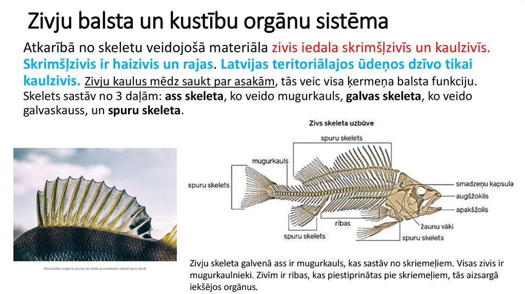 Atkarībā no skeletu veidojošā materiāla zivis iedala skrimšļzivīs un kaulzivīs.Skrimšļzivis ir haizivis un rajas. Latvijas teritoriālajos ūdeņos dzīvo tikai