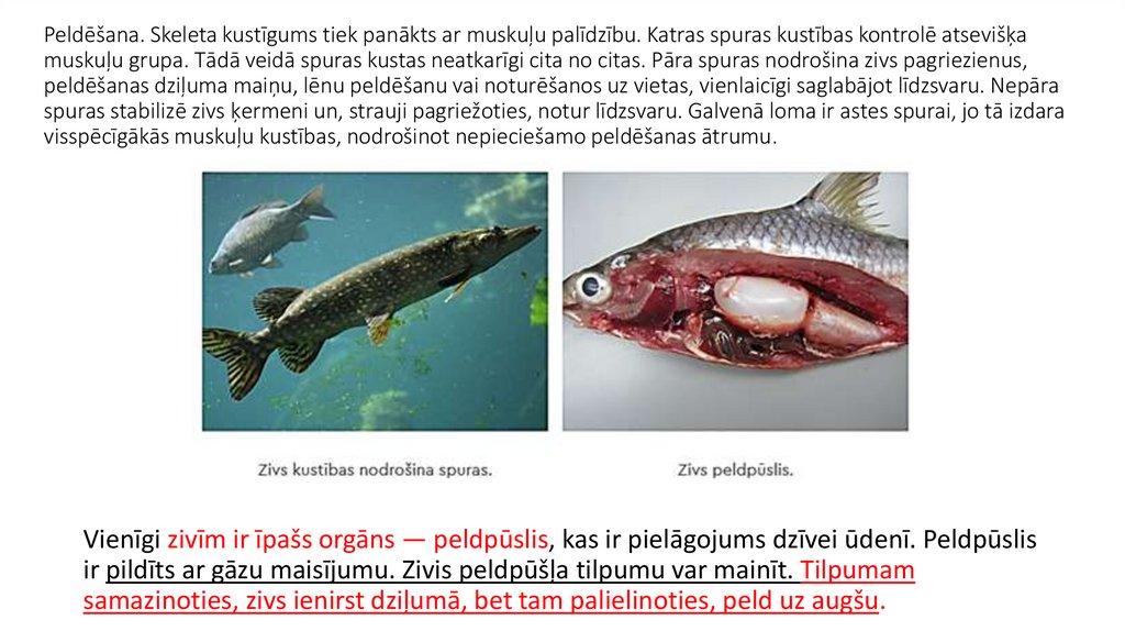23. Peldēšana. Skeleta kustīgums tiek panākts ar muskuļu palīdzību. Katras spuras kustības kontrolē atsevišķa muskuļu grupa. Tādā