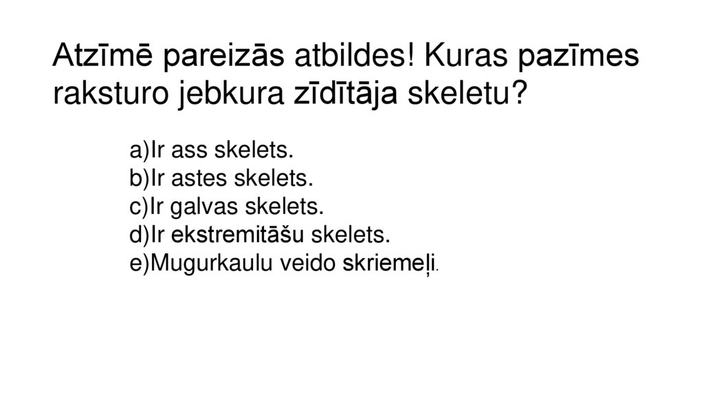 Atzīmē pareizās atbildes! Kuras pazīmesraksturo jebkura zīdītāja skeletu?