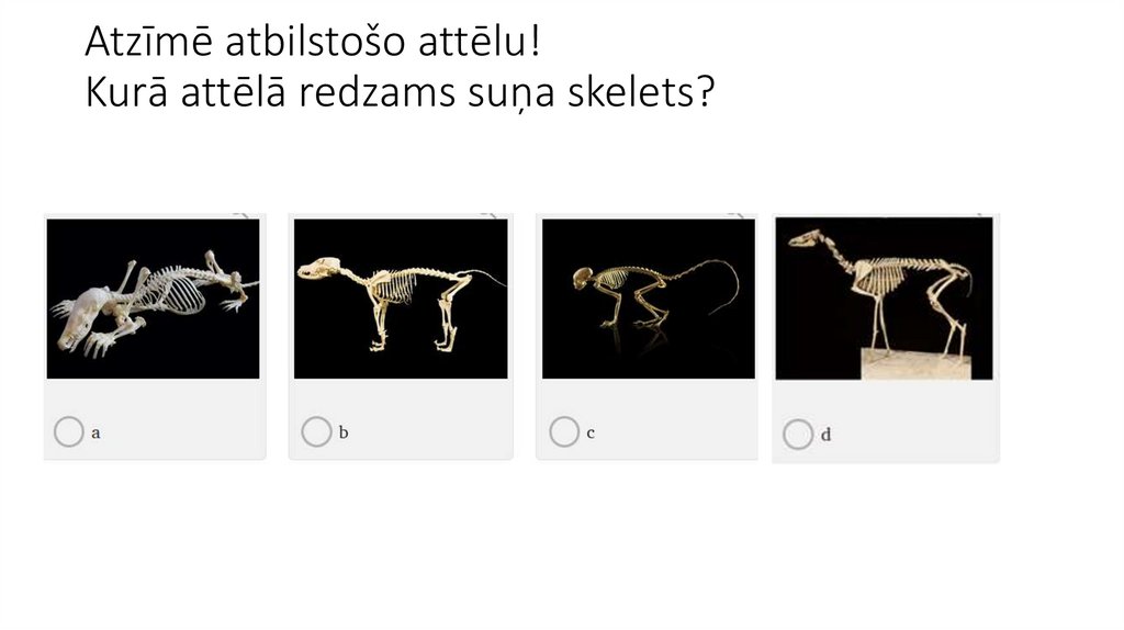 27. Atzīmē atbilstošo attēlu! Kurā attēlā redzams suņa skelets?