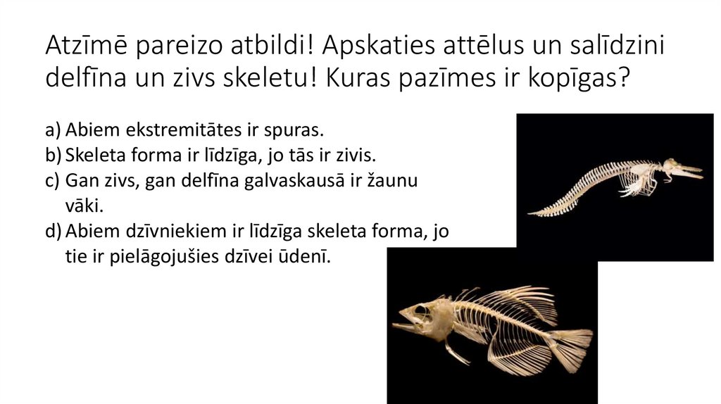 29. Atzīmē pareizo atbildi! Apskaties attēlus un salīdzini delfīna un zivs skeletu! Kuras pazīmes ir kopīgas?