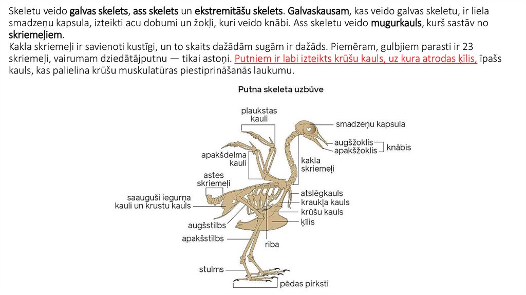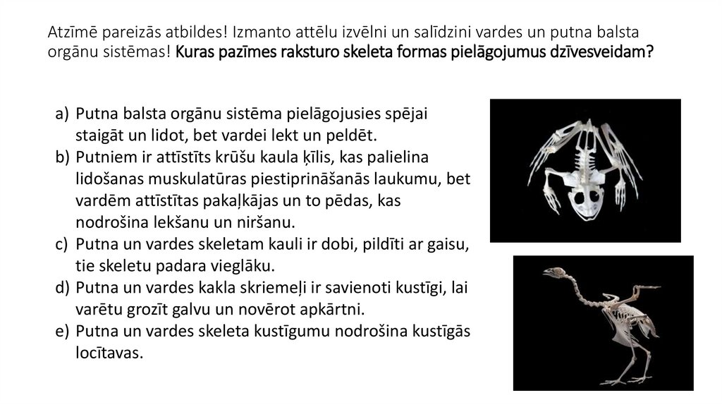 skeleta formas pielāgojumus dzīvesveidam?a) Putna balsta orgānu sistēma pielāgojusies spējai
