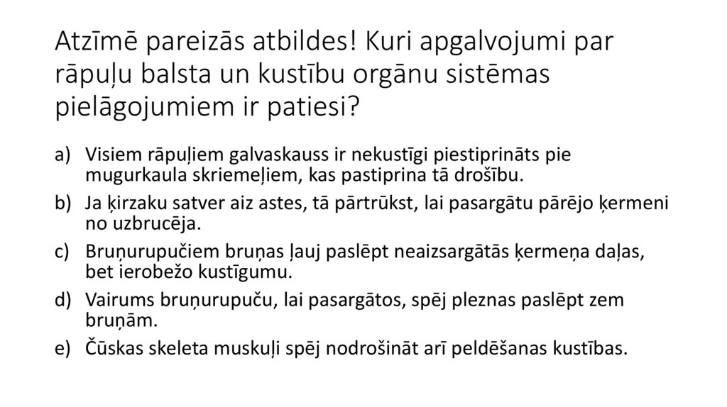 c) Bruņurupučiem bruņas ļauj paslēpt neaizsargātās ķermeņa daļas,
