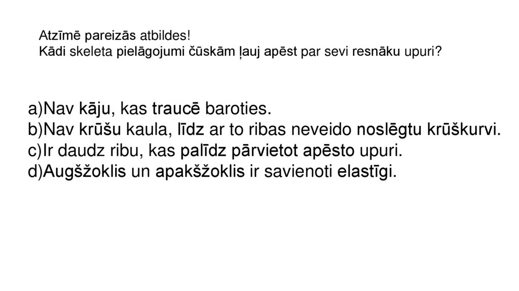 Jautājums: Kas ir kopīgs un kas atšķirīgs šo dzīvnieku skeletos, un kā šoatšķirību cēloņus var izskaidrot?