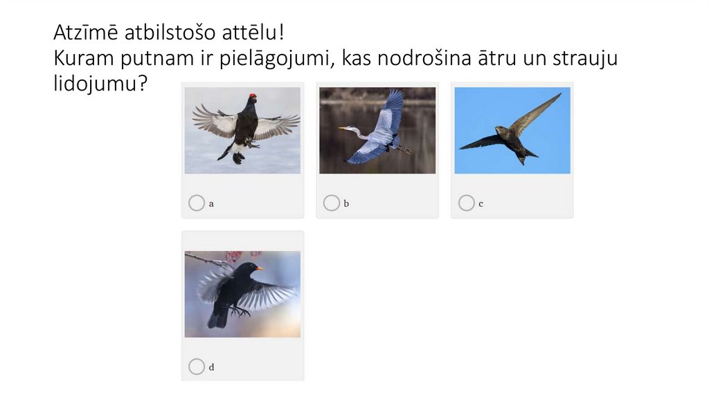 Atbildi! Kā sauc zivs kustību orgānus?35. Atzīmē atbilstošo attēlu! Kuram putnam ir pielāgojumi, kas nodrošina ātru un strauju lidojumu?