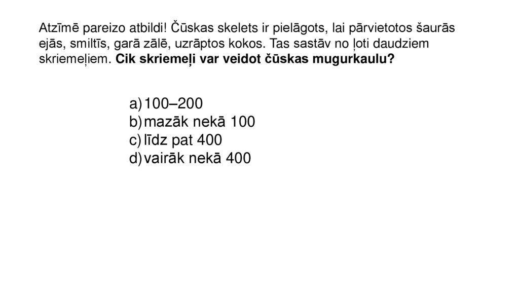 36. Atzīmē pareizo atbildi! Čūskas skelets ir pielāgots, lai pārvietotos šaurās ejās, smiltīs, garā zālē, uzrāptos kokos. Tas