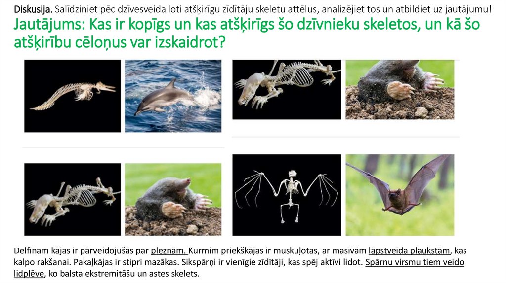 6. Diskusija. Salīdziniet pēc dzīvesveida ļoti atšķirīgu zīdītāju skeletu attēlus, analizējiet tos un atbildiet uz jautājumu!