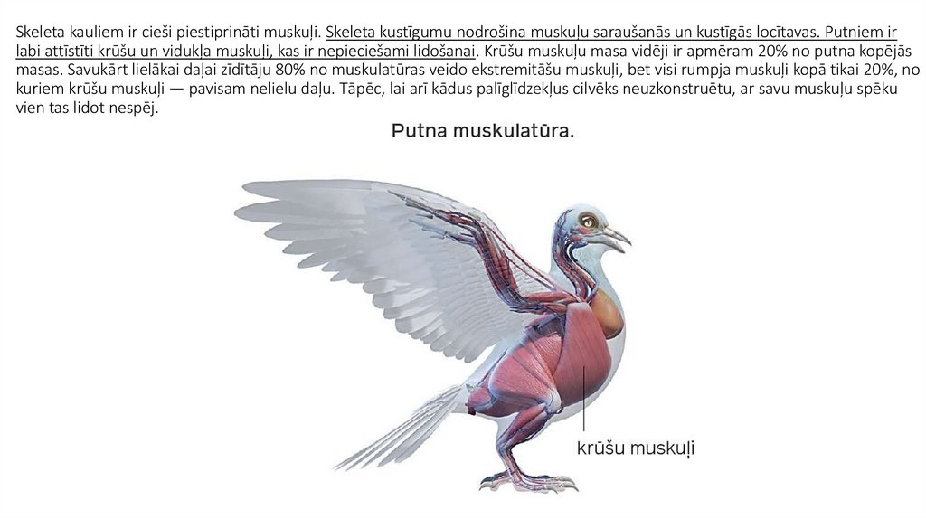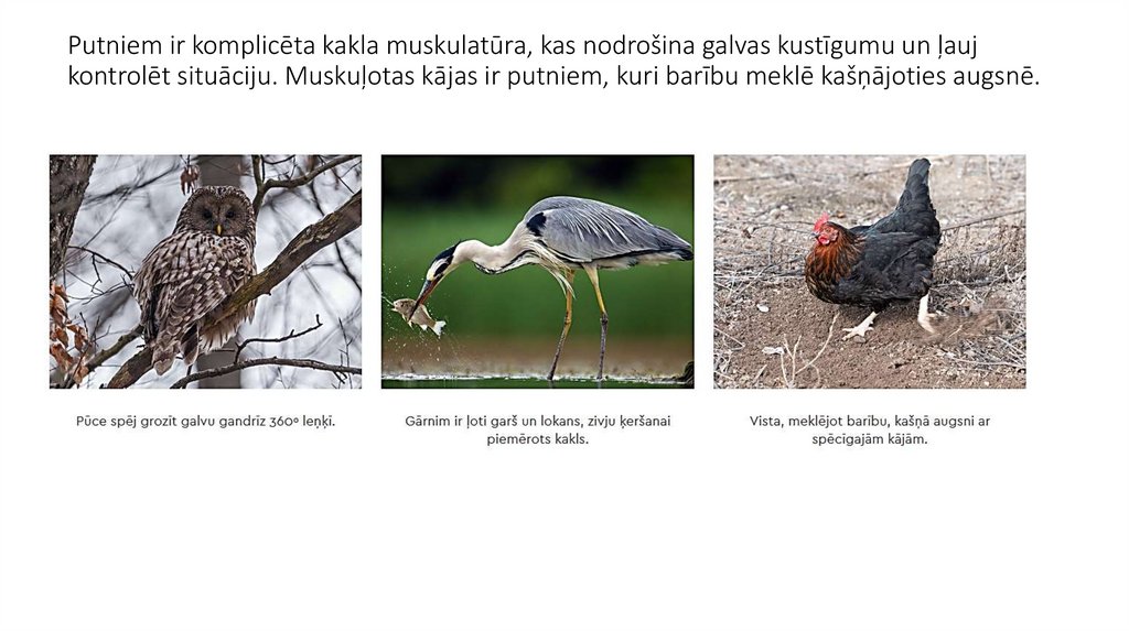 10. Putniem ir komplicēta kakla muskulatūra, kas nodrošina galvas kustīgumu un ļauj kontrolēt situāciju. Muskuļotas kājas ir