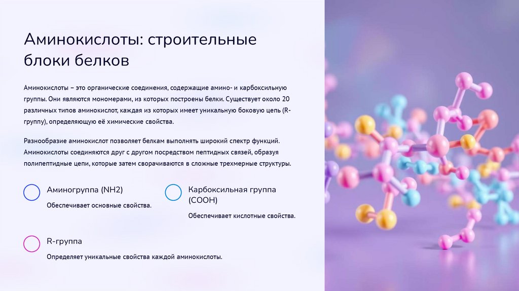 различных типов аминокислот, каждая из которых имеет уникальную боковую цепь (Rгруппу), определяющую её химические свойства.