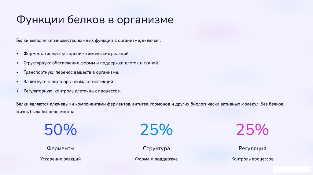 Функции белков в организмеБелки выполняют множество важных функций в организме, включая: