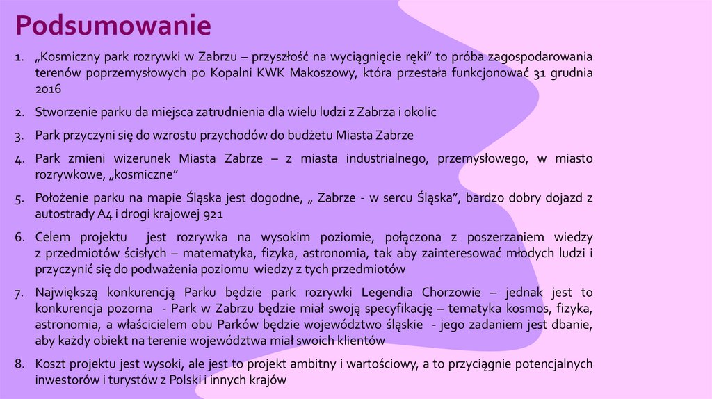 Podsumowanie1. „Kosmiczny park rozrywki w Zabrzu – przyszłość na wyciągnięcie ręki” to próba zagospodarowania