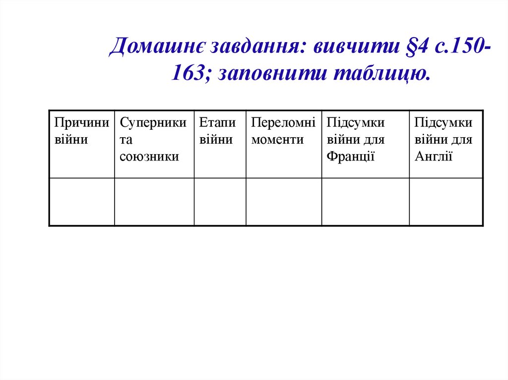 Домашнє завдання: вивчити §4 с.150163; заповнити таблицю.Причини Суперники Етапи