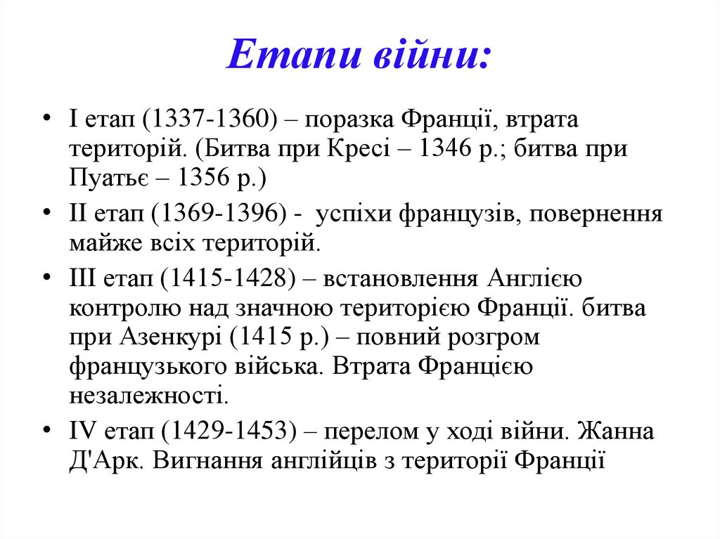 • I етап (1337-1360) – поразка Франції, втрататериторій. (Битва при Кресі – 1346 р.; битва при