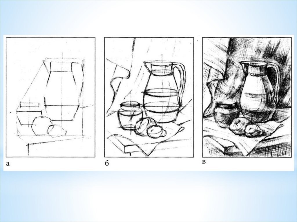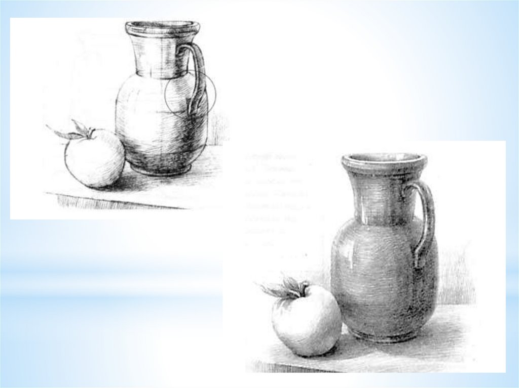 Натюрморт. Рисунок кувшина с муляжом, на светлом фоне без складок