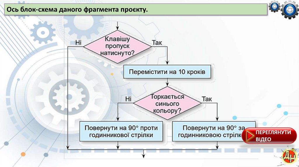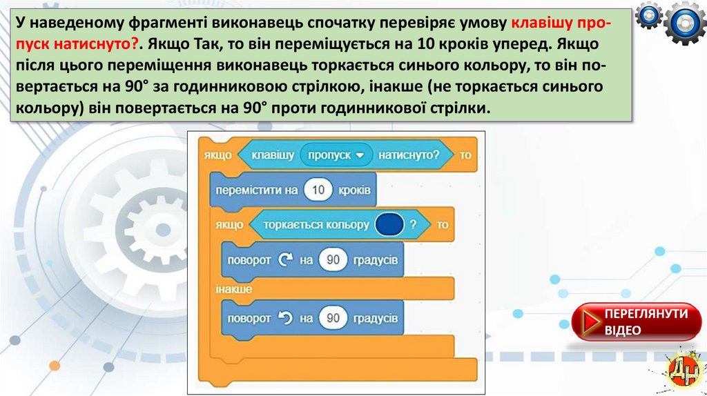 У наведеному фрагменті виконавець спочатку перевіряє умову клавішу пропуск натиснуто?. Якщо Так, то він переміщується на 10 кроків уперед. Якщопісля цього переміщення виконавець торкається синього кольору, то він повертається на 90° за годинниковою стрілкою, інакше (не торкається синього