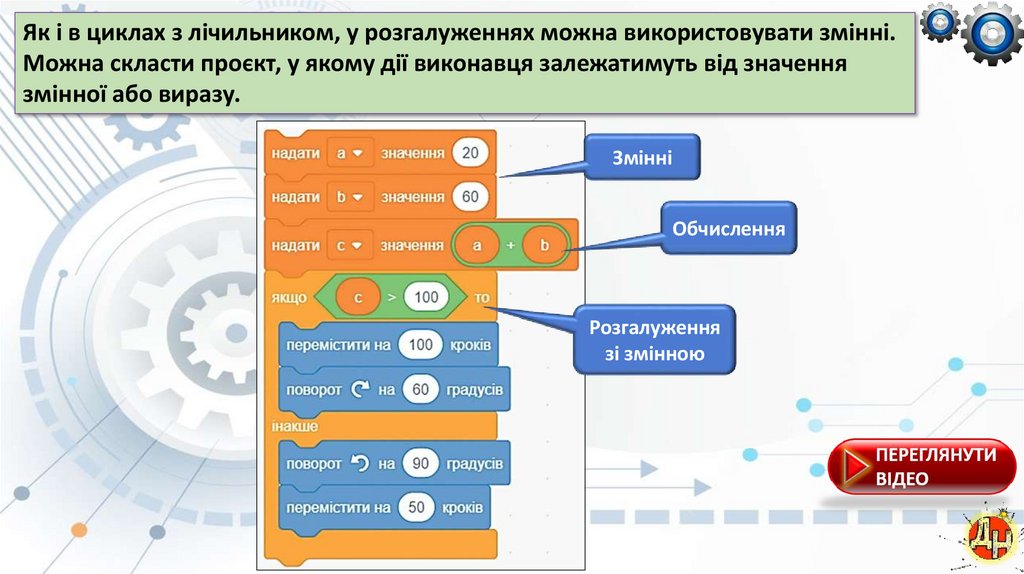 Як і в циклах з лічильником, у розгалуженнях можна використовувати змінні.Можна скласти проєкт, у якому дії виконавця залежатимуть від значення