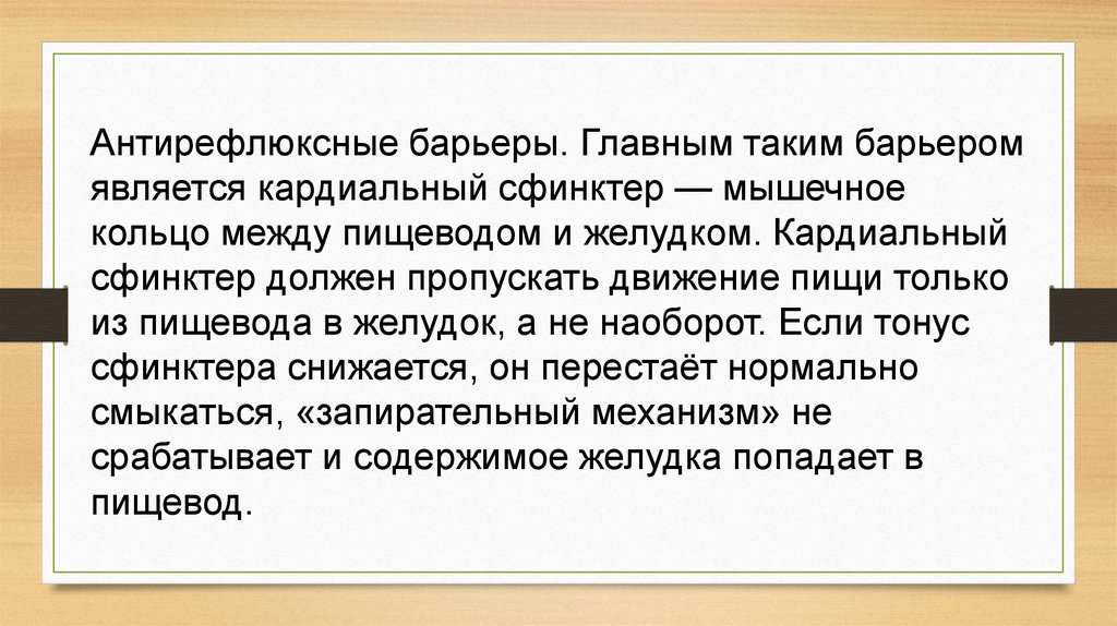 Антирефлюксные барьеры. Главным таким барьеромявляется кардиальный сфинктер — мышечное
