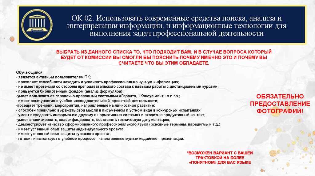 ОК 02. Использовать современные средства поиска, анализа иинтерпретации информации, и информационные технологии для