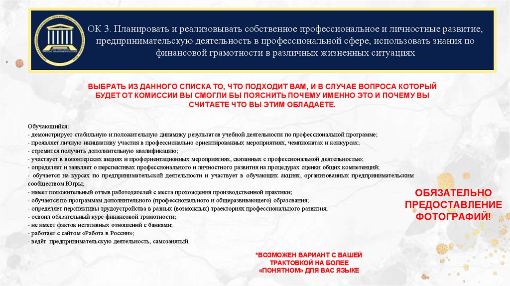 ОК 3. Планировать и реализовывать собственное профессиональное и личностные развитие,предпринимательскую деятельность в профессиональной сфере, использовать знания по