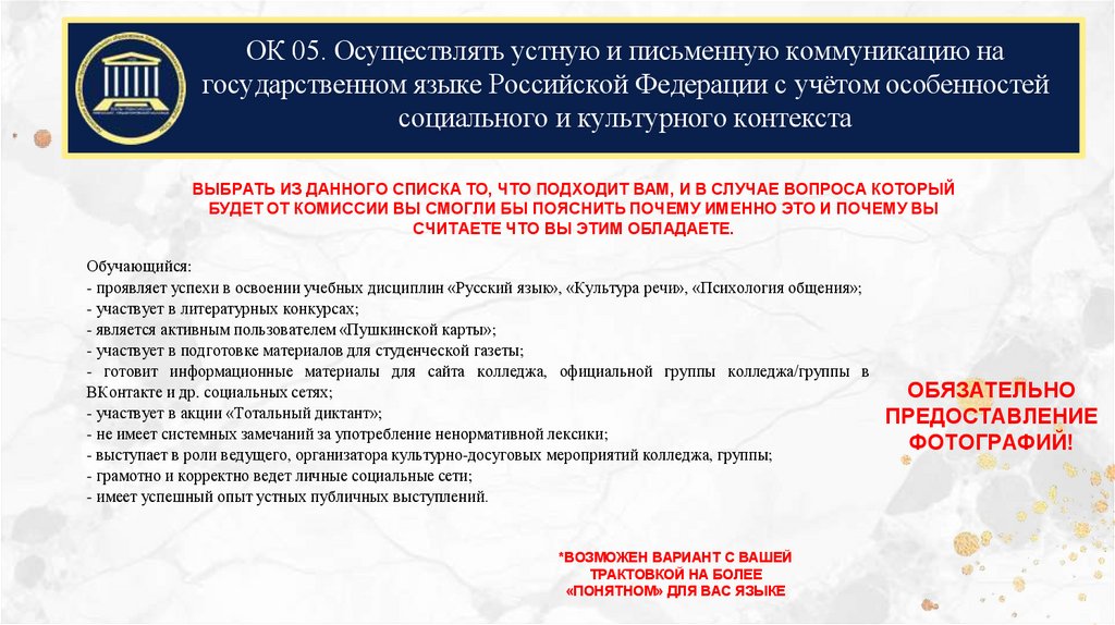 ОК 05. Осуществлять устную и письменную коммуникацию нагосударственном языке Российской Федерации с учётом особенностей
