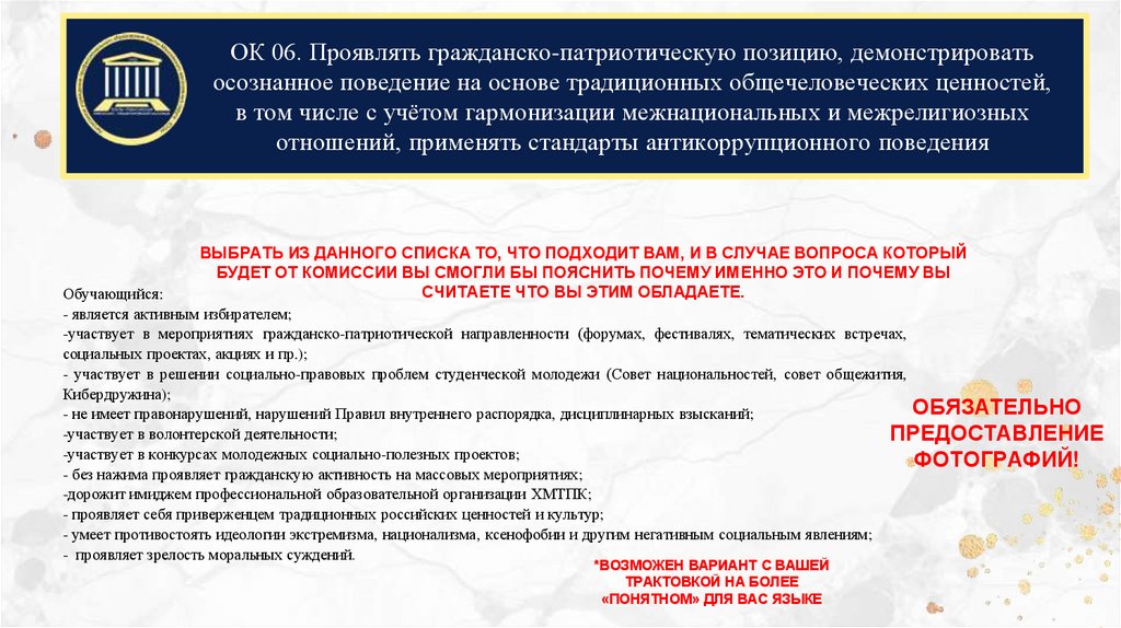 ОК 06. Проявлять гражданско-патриотическую позицию, демонстрироватьосознанное поведение на основе традиционных общечеловеческих ценностей,
