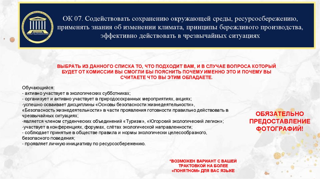 ОК 07. Содействовать сохранению окружающей среды, ресурсосбережению,применять знания об изменении климата, принципы бережливого производства,