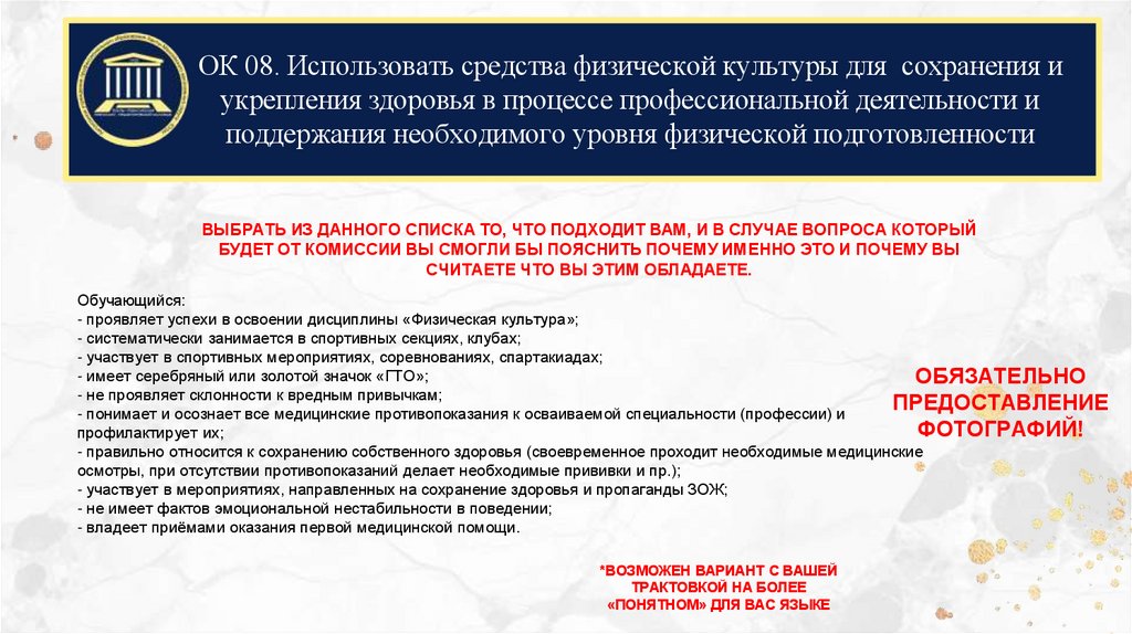 ОК 08. Использовать средства физической культуры для сохранения иукрепления здоровья в процессе профессиональной деятельности и