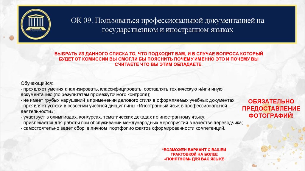 ОК 09. Пользоваться профессиональной документацией нагосударственном и иностранном языках