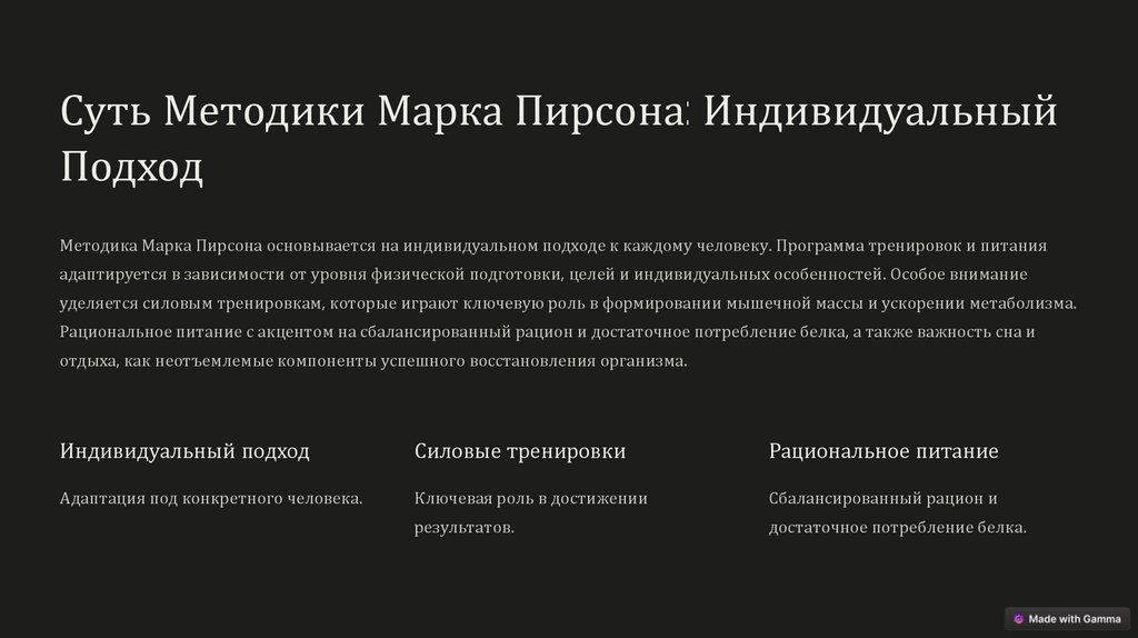 Методика Марка Пирсона основывается на индивидуальном подходе к каждому человеку. Программа тренировок и питания
