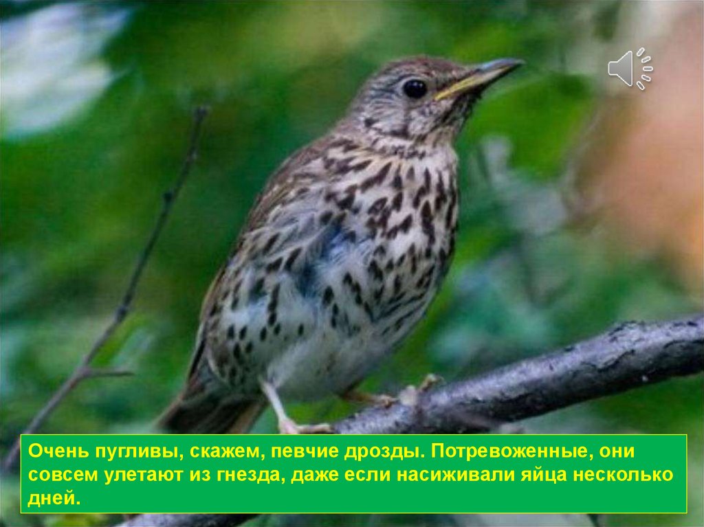 Очень пугливы, скажем, певчие дрозды. Потревоженные, онисовсем улетают из гнезда, даже если насиживали яйца несколько