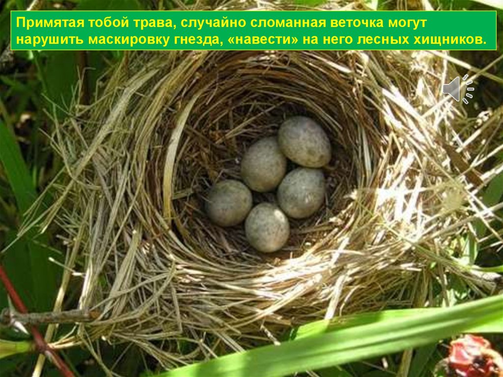 Примятая тобой трава, случайно сломанная веточка могутнарушить маскировку гнезда, «навести» на него лесных хищников.