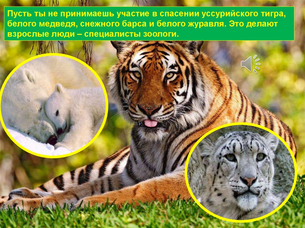 Пусть ты не принимаешь участие в спасении уссурийского тигра,белого медведя, снежного барса и белого журавля. Это делают