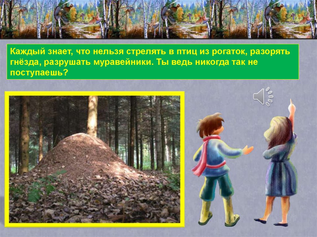 Каждый знает, что нельзя стрелять в птиц из рогаток, разорятьгнёзда, разрушать муравейники. Ты ведь никогда так не